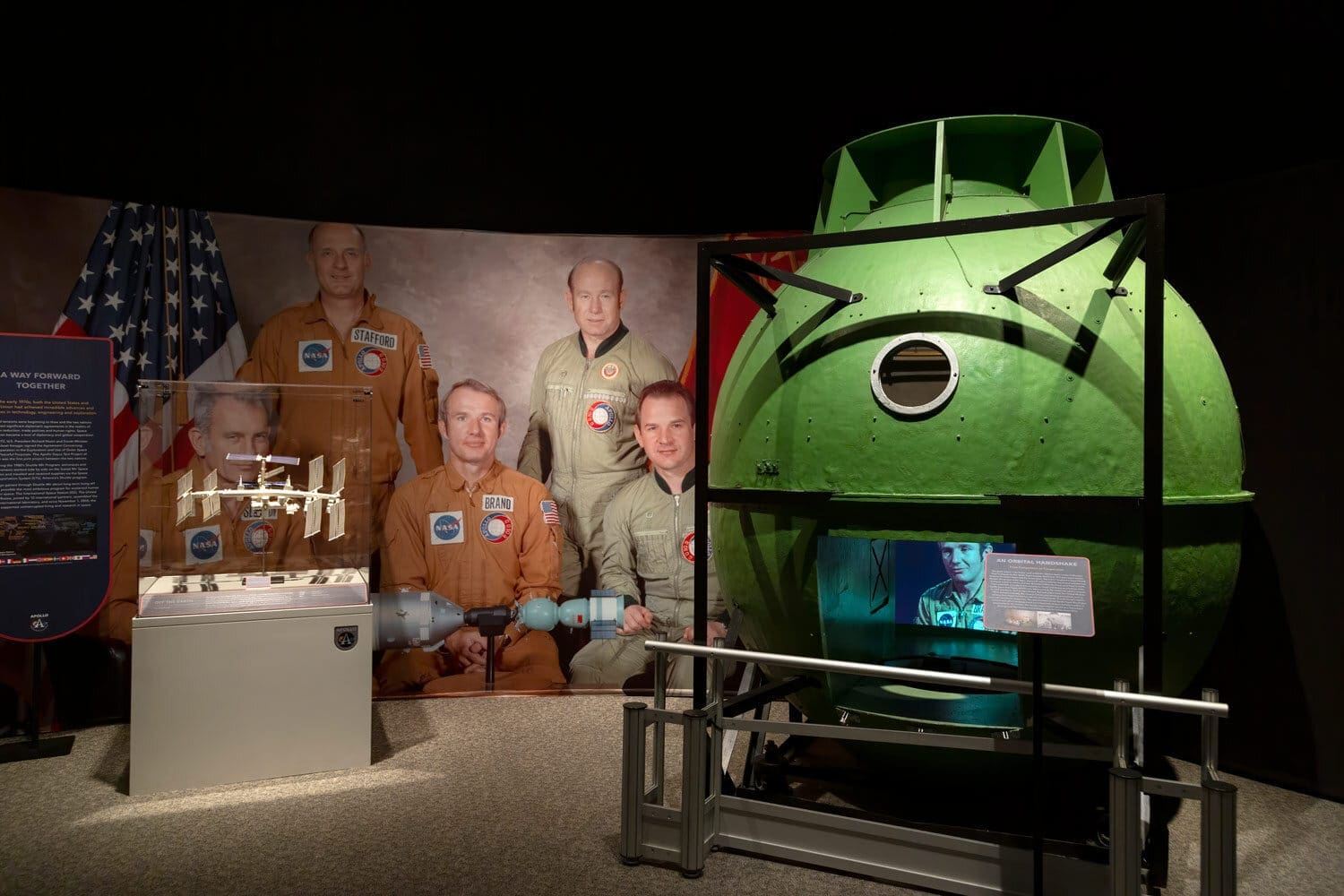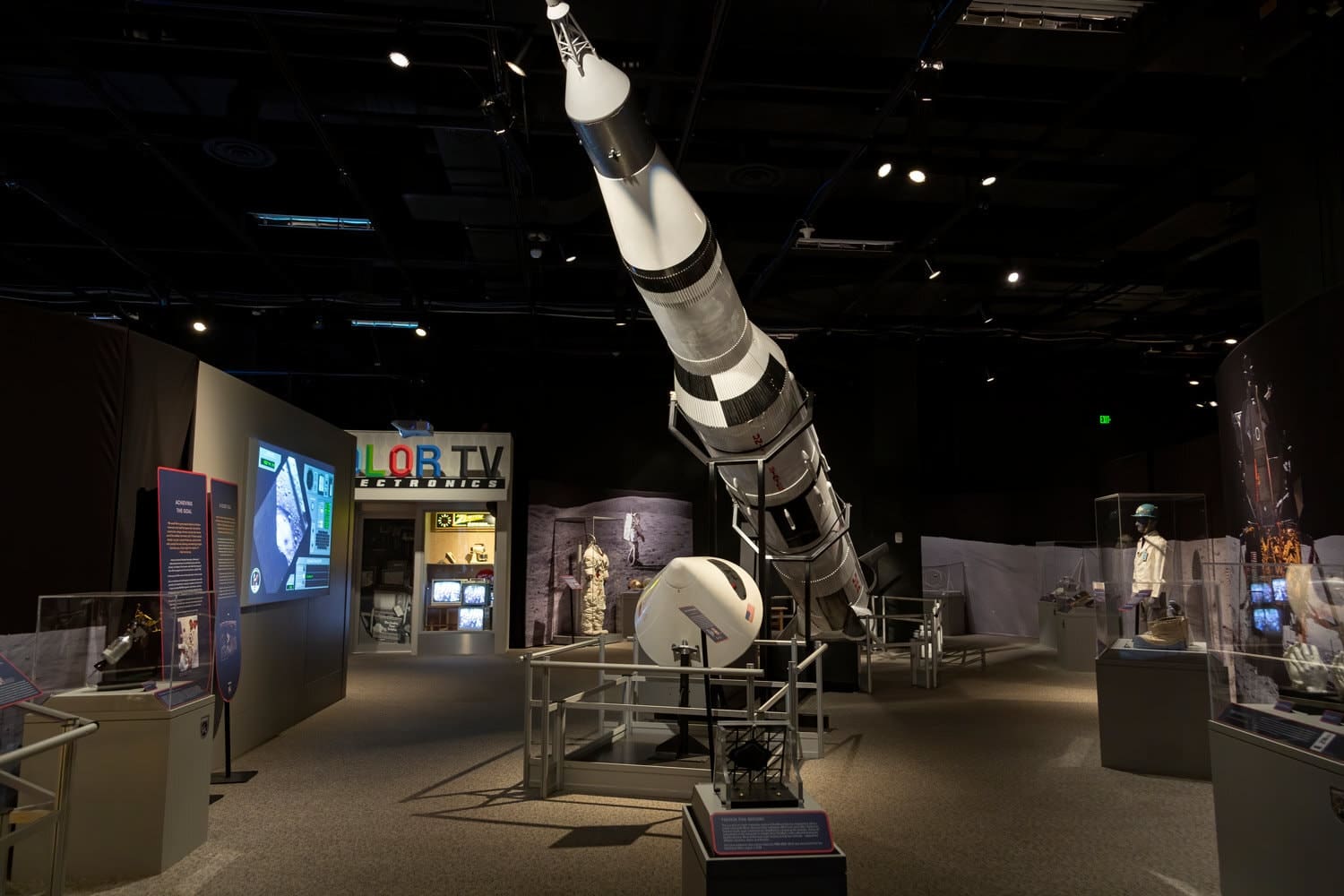 Flying Fish brought the exhibition to life by fabricating high-quality, durable exhibit elements designed to withstand the rigors of a global tour. From custom-built set pieces and scenic elements to dynamic interactive displays, every detail was carefully crafted to immerse visitors in the Apollo era. The exhibition featured hands-on experiences like a virtual moonwalk and an Apollo 11 launch simulation. Flying Fish also handled artifact acquisition and preservation, ensuring the safe transport and display of Apollo suits, Von Braun’s drafting set, a lunar meteorite, and Soviet space suits. Custom-engineered, climate-controlled crates protected these invaluable artifacts during transit. The exhibition incorporated advanced audiovisual systems, including 360-degree projection technology and touchable interactive displays to enhance visitor engagement. Construction drawings and documentation provided venues with precise guidelines for installation and adaptation.
